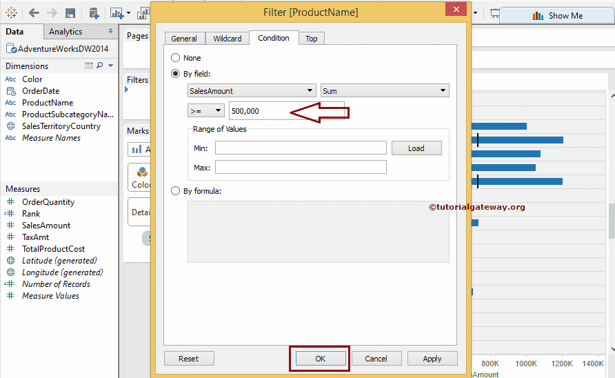 我们在“产品名称”维度上应用了一个过滤器,条件如下。这意味着 Tableau 迷你图将显示销售金额大于或等于 500,000 的产品。
