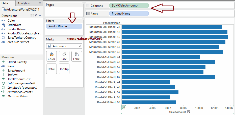 首先,将“英文产品名称”从“维度”区域拖放到“行”架上,将“销售金额”从“度量”区域拖放到“列”架上。默认情况下,Tableau Desktop 会生成条形图。我们还对产品名称应用了上述过滤器。