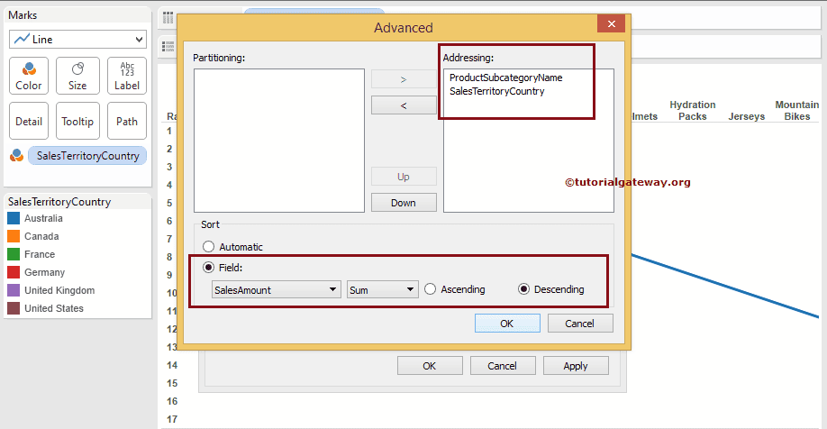 选择“高级”选项后,会打开一个新窗口。请将“产品子类别名称”和“销售区域国家/地区”列从“分区”窗格转移到“寻址”窗格。接下来,将“排序”选项从“自动”更改为“字段”。然后,从下拉菜单中选择字段名称和聚合字段。