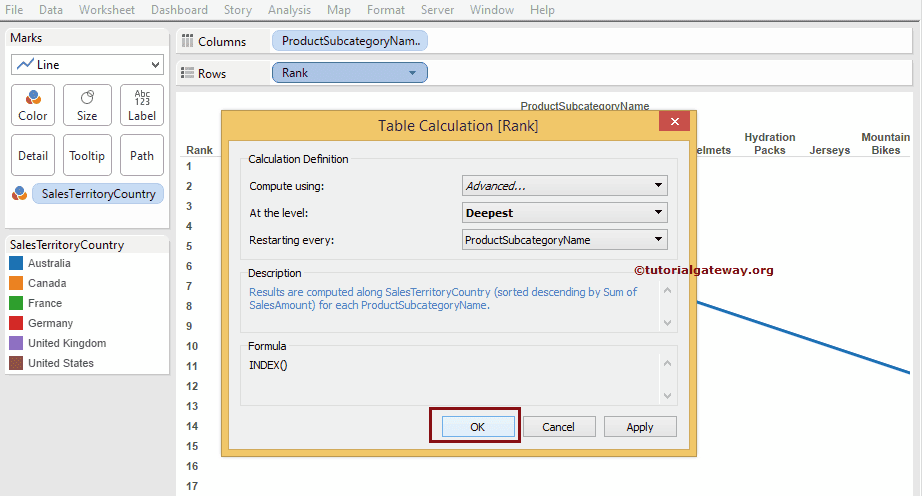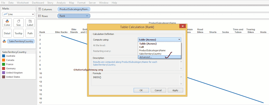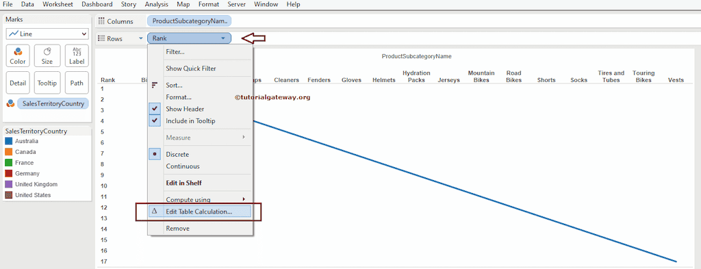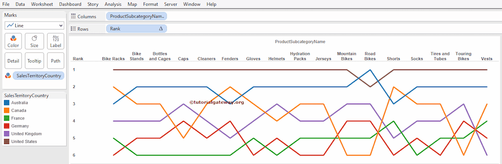 然而,我们打算使用 Sales Amount 度量来根据 Country Name 对 ProductSubcategory Name 进行排名。在更改计算字段之前,让我们将标记类型从“自动”更改为折线图。完成后,将出现以下排名图截图。
