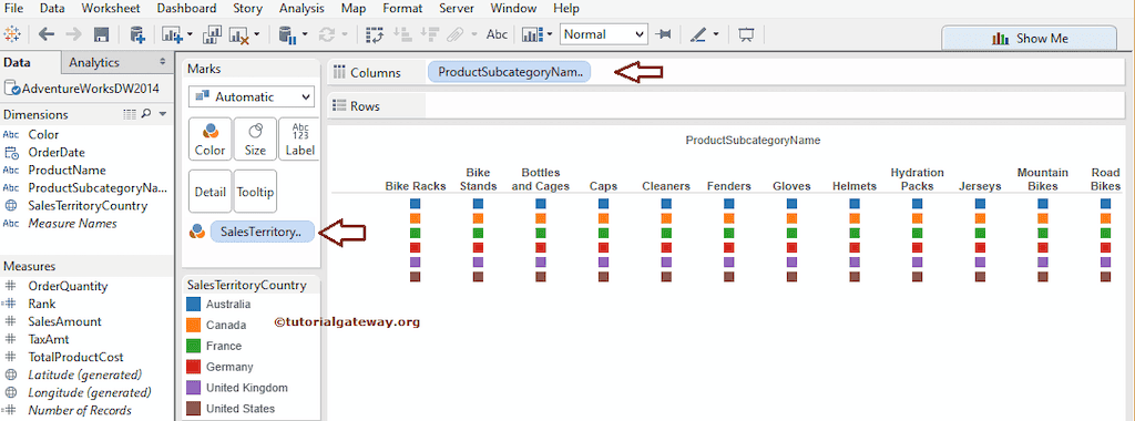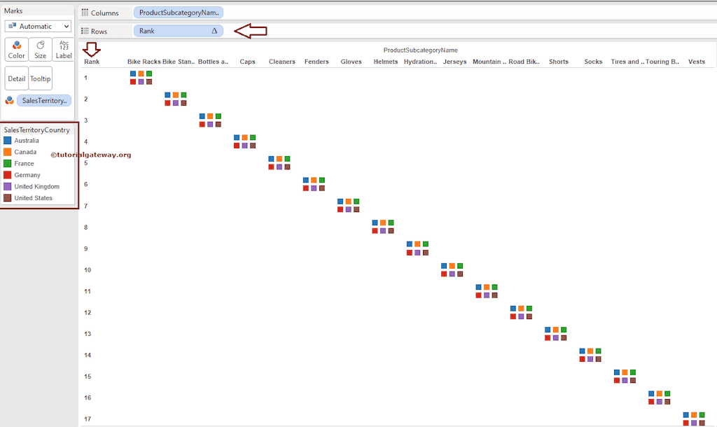 要创建排名图,请将“维度”区域中的“产品子类别名称”拖放到“列”功能区。接下来,将“销售区域国家/地区”拖放到“标记”卡中的“颜色”列。