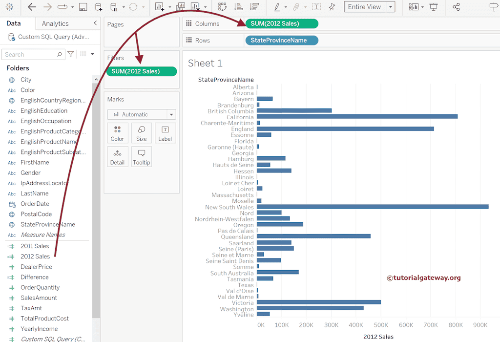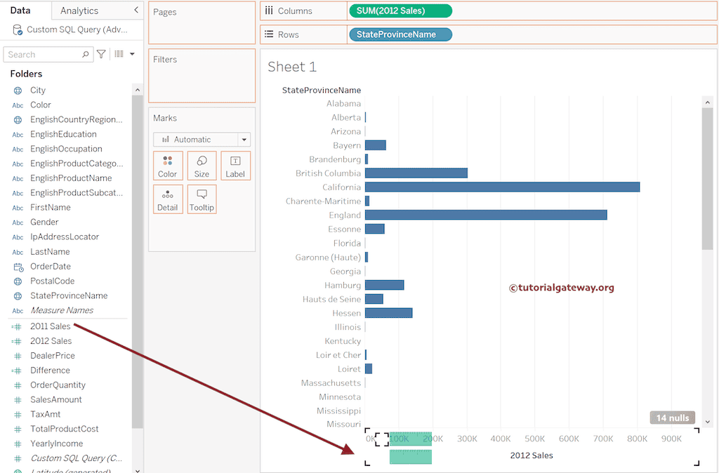 将“2012 年销售额合计”拖放到“列”架上,并将“州/省份名称”拖放到“行”架上。由于图表中存在一些空值,我们使用“筛选器”架过滤了这些数据。您可以看到,默认情况下,它已经为您创建了一个条形图。要查看更多图表 >> 点击这里。