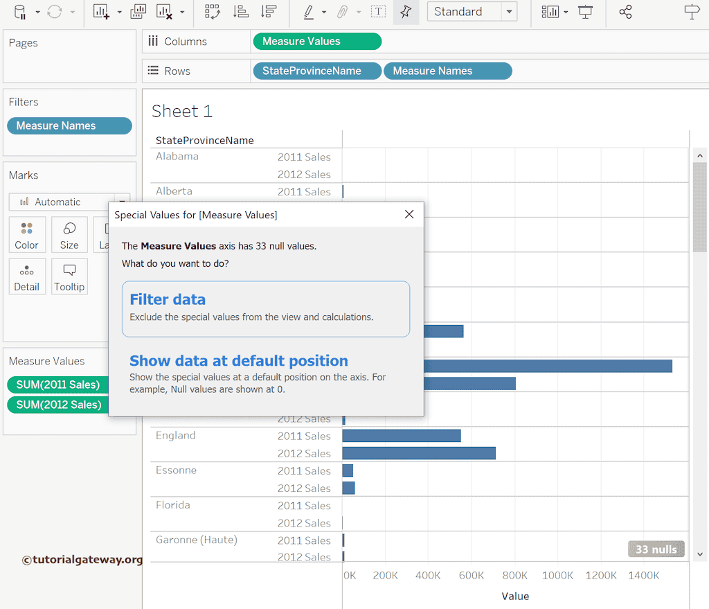 由于某些州有空值(无销售数据),将打开以下“度量值”的特殊值弹出窗口。我们在 Tableau 彗星图中不需要任何空值,因此请选择“过滤数据”选项以删除所有空值。接下来,请将“标记”字段从“自动”更改为“线”。
