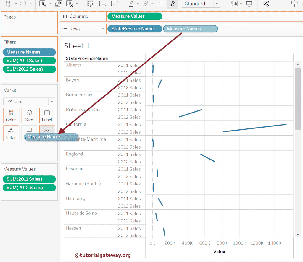 这将创建一个双组合线图。请将“度量名称”从“行”架拖到“路径”架上,而不是显示 2011 年和 2022 年销售额的垂直线,它会显示水平线。接下来,使用 Control 键将“度量名称”添加到“大小”架上,以根据销售额更改线的大小。