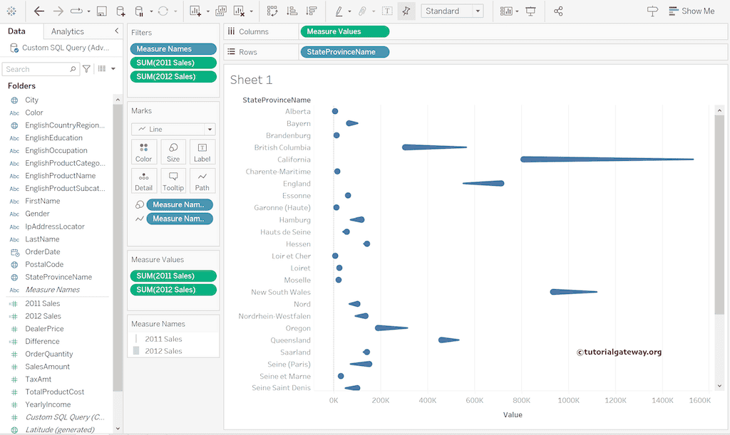 为了演示彗星图,我们使用了 AdventureWorks 数据库。请访问《报表中的数据标签》文章,以了解 Tableau 数据源。
