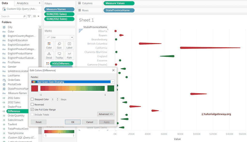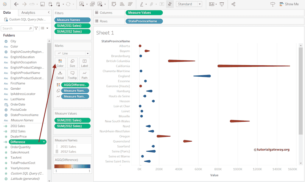 将“差值”计算字段从“度量”拖到“颜色”架上。它会显示负销售额的棕色和正销售额的蓝色。