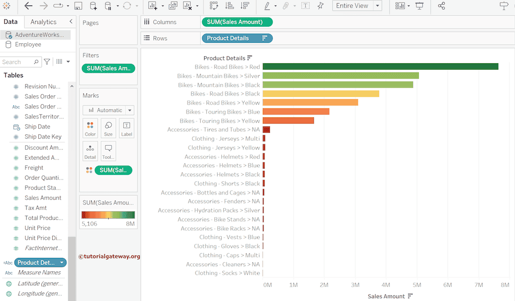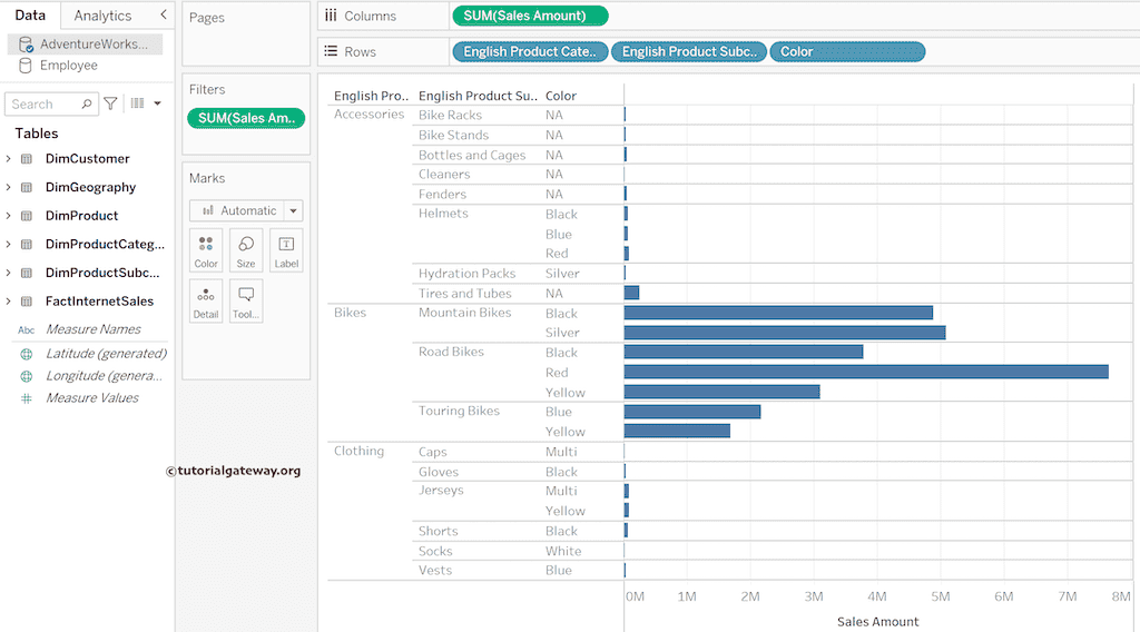 以上所有示例都适用于表格。但是,当您在图表中使用字符串连接时,真正的威力就显现出来了。为了演示这一点,我将 Adventure Works 数据库中的 Product Category、Product Subcategory 和 Color 添加到 Column Shelf,并将 Sales Amount 添加到 Rows Shelf。如果您观察下面的屏幕截图,条形图报告看起来很奇怪,难以理解数据。