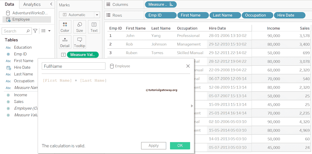 在 Tableau 中,字符串连接不仅限于两个,您可以连接更多列,并且分隔符可以是数字、空格、逗号、连字符等。在此示例中,我们将通过连接名字和姓氏、教育背景和职业来构建员工的详细信息。如果您查看表达式,我们使用了空格、连字符和下划线分隔列。