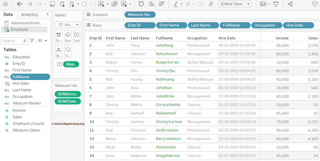 接下来,我将 FullName 计算字段添加到表的 LastName 和 Occupation 之间。从下面的屏幕截图中,您可以看到完整的姓名,但名字和姓氏之间没有空格。这里,为了在列中突出显示,我们格式化了文本。为此,右键单击任何单元格并单击“Format”或使用“Format”菜单。请参考 Tableau 中的其他 Functions 文章。
