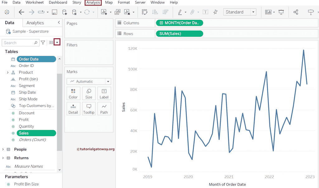 将“Sales”(销售额)度量拖放到“Rows”(行)架上,并将“Order Date”(订单日期)字段拖放到“Columns”(列)架上。接下来,单击“YEAR(Order Date)”旁边的向下箭头,选择“MONTH”(月份)(而不是“Year”(年份))。默认情况下,它会创建一个折线图。有关 Tableau 中其余图表的更多信息,请单击此处。