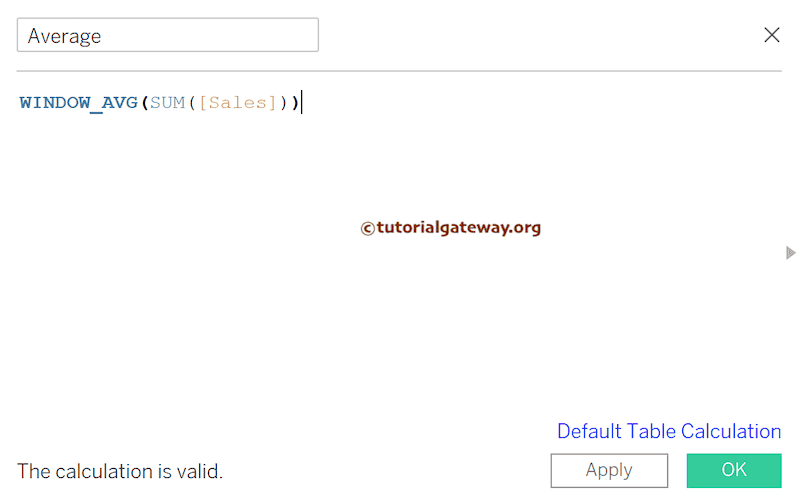 以下表达式将返回销售额总计的窗口平均值(整个报告或表格)。