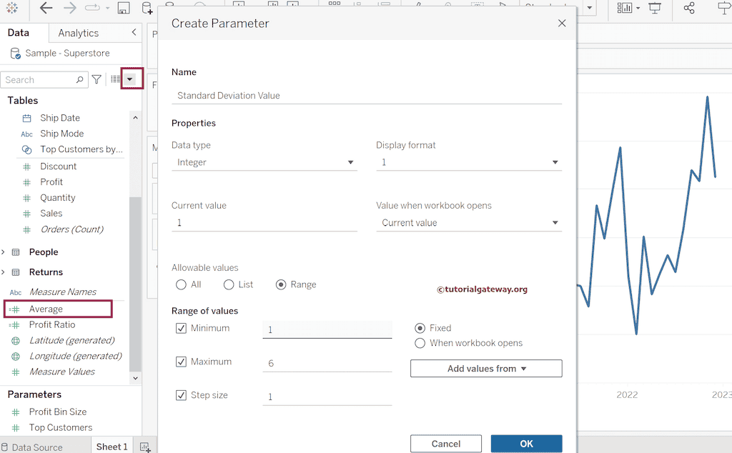 我将使用“Standard Deviation Value”(标准差值)作为参数名称,选择“Integer”(整数)作为数据类型,并使用 1 到 6 的值范围,步长为 1。