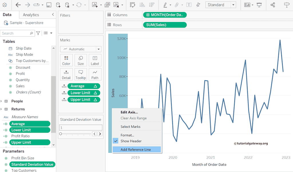 如果您观察下面的报告,它看起来没有变化。创建控制图的下一步是添加参考线。所以,右键单击“Sales Axis”(销售额轴)(Y 轴),然后选择“Add Reference Line”(添加参考线)选项。