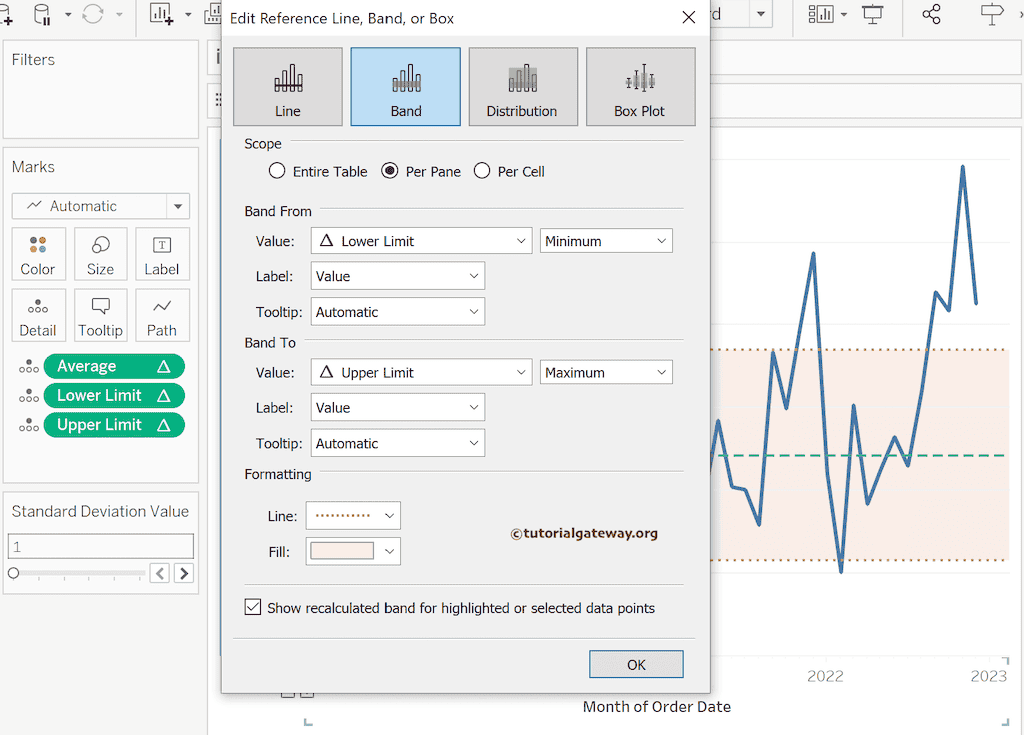 由于我们需要下限和上限,请编辑参考线,选择“Band”(带)选项,并将“from”(从)值设置为“Minimum Lower Limit”(最小下限),将“to”(到)值设置为“Maximum Upper Limit”(最大上限)。进行一些格式设置,以便可以看到它们。