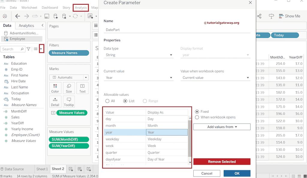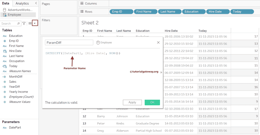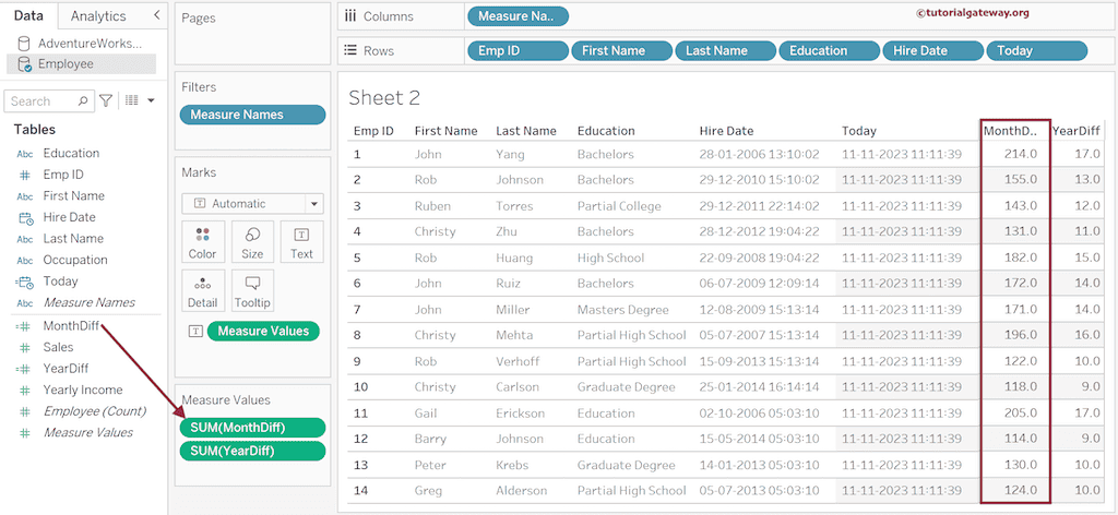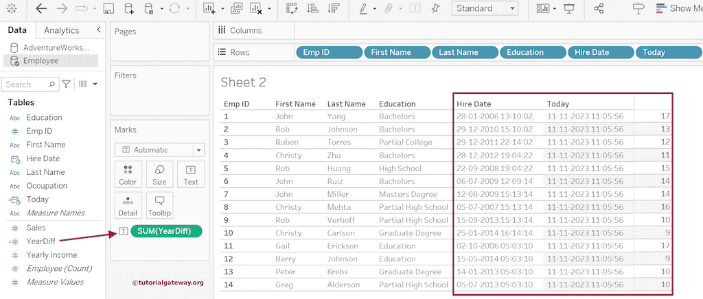 我们还创建了另一个名为 Today 的计算字段,并使用了 NOW() 函数来获取当前日期。接下来,将 Today 添加到表中,并将 YearDiff 添加到 Text 区域,以查看 Tableau DATEDIFF 函数生成的差值。