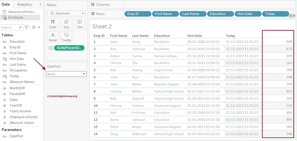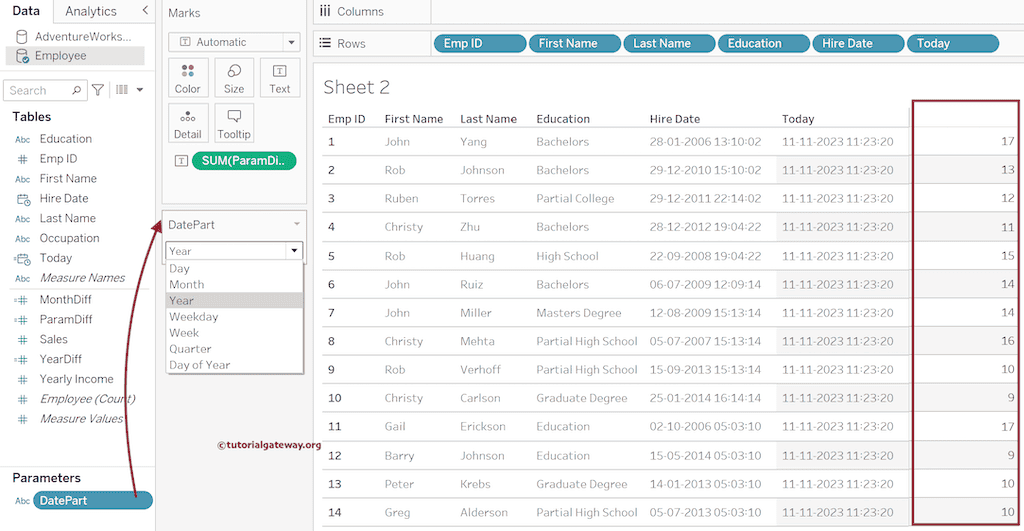 DATEDIFF([DatePart], [Hire Date], NOW())