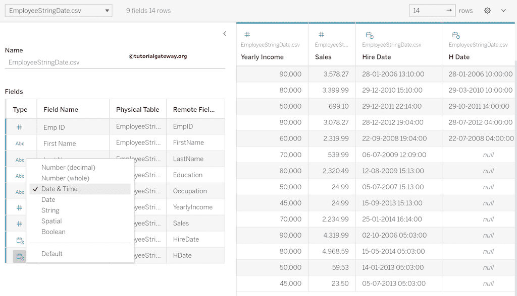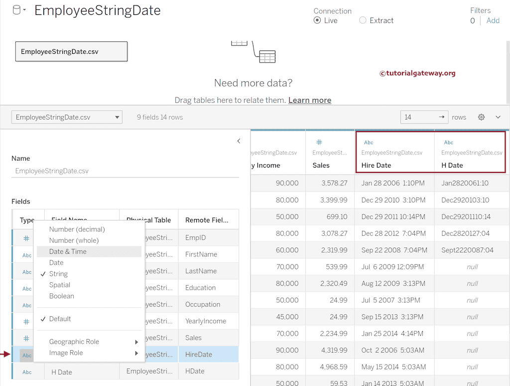 在数据源中的“字段”部分,单击 HireDate 旁边的 Abc 类型将打开下面的上下文菜单。如果您观察图像,默认情况下它会勾选字符串。因此,请将其更改为日期和时间。请参阅 Tableau 中有关日期函数和其他函数的文章。
