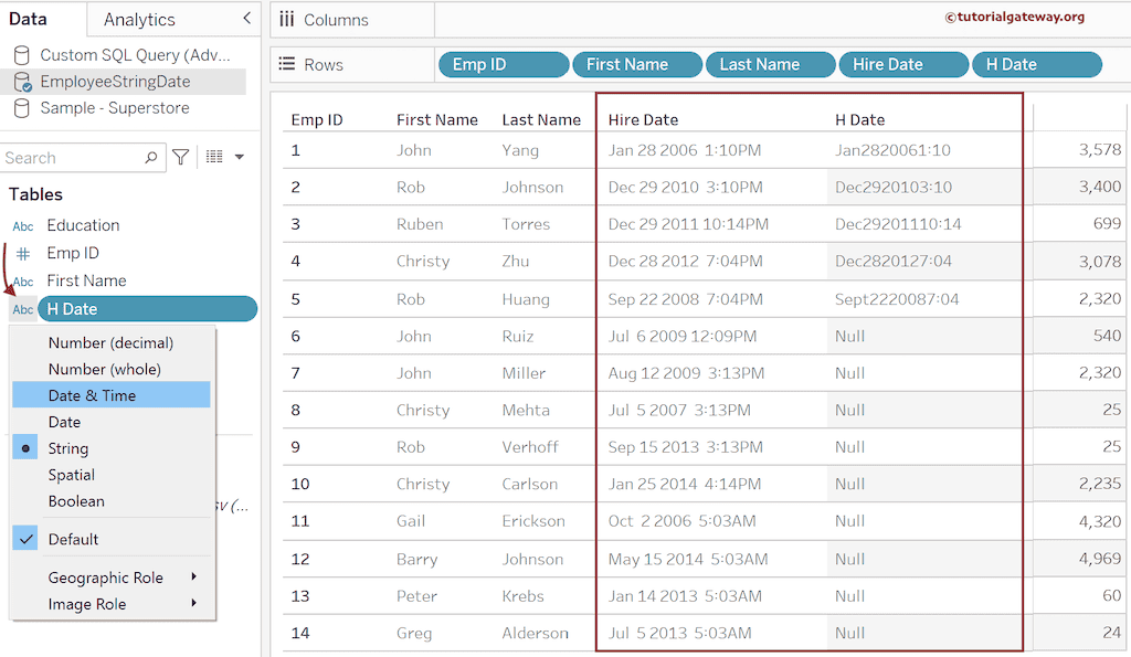 为了演示 Tableau DATEPARSE 函数,我们将使用一个简单的员工表,其中 HireDate 和 HDate 列包含日期和时间。但是,数据类型是字符串(Abc)。
