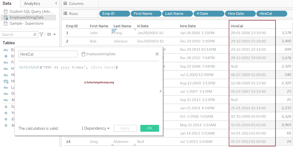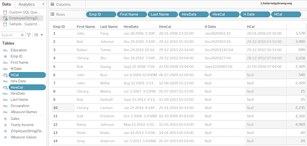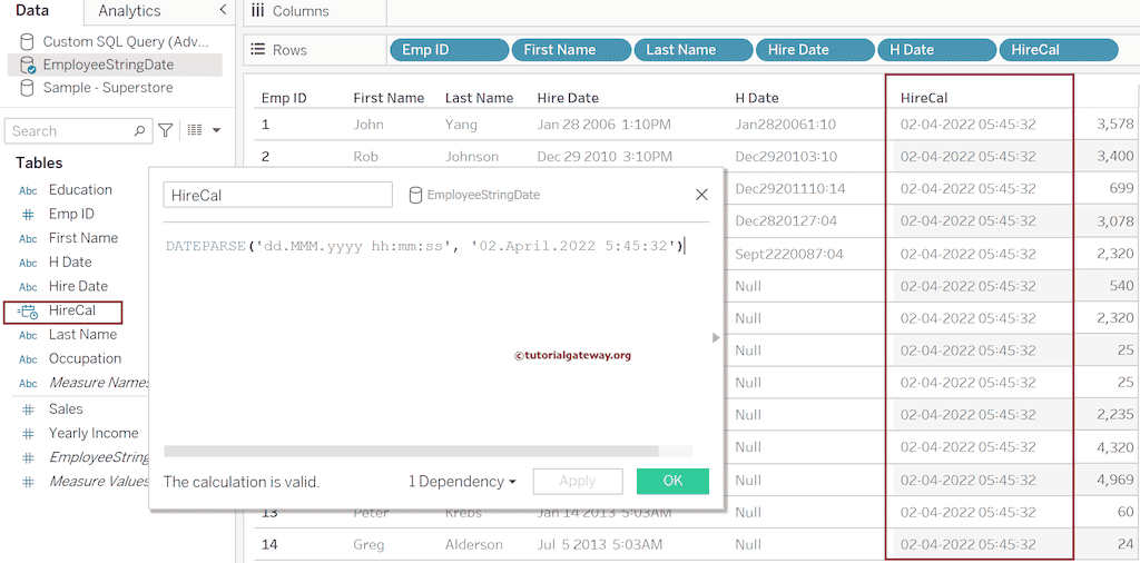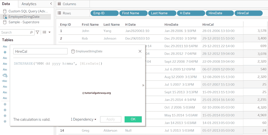 让我介绍一种将字符串转换为日期的基本方法。如果您观察表达式,我们在 Tableau DATEPARSE 函数内部使用了一个静态表达式,它将为 HireCal 列的每一行显示相同的日期和默认时间。