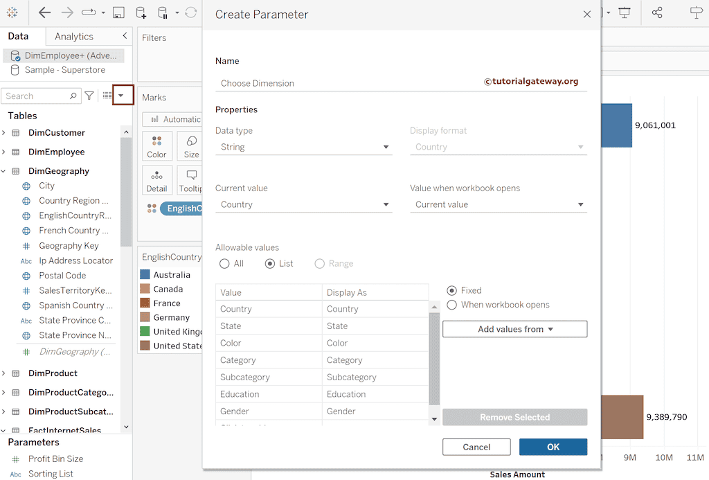 以上所有值都是来自不同表的字符串列或维度,这些表通过主键和外键连接。在此 Tableau 维度作为筛选报告的参数示例中,我们的目标是当用户选择以上任何值时,条形图都应显示该字符串列的销售额。例如,Gender 意味着国家名称必须被性别替换,并显示按性别(男性和女性)划分的销售额。