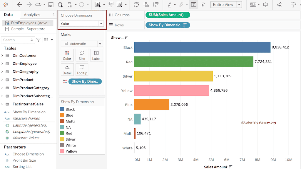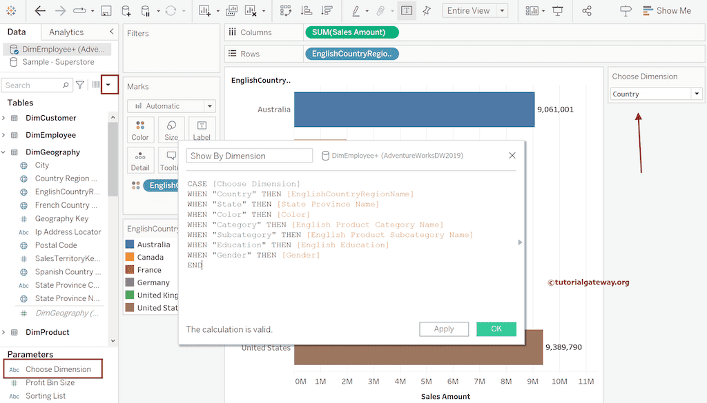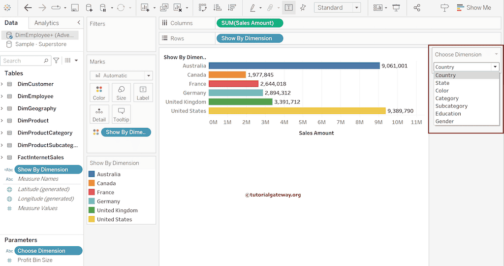 请用 Choose Dimension 计算字段替换行和颜色架中的 EnglishCountryRegionName。默认情况下,它将显示按国家/地区划分的销售额,因为它是默认参数值。您可以在 Tableau 报告的右侧看到可用维度列表,作为筛选的参数值。