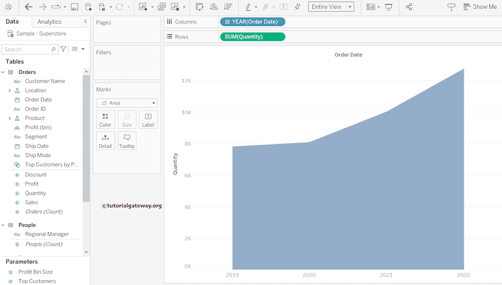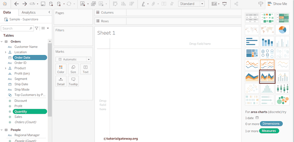 我们需要一个日期字段和至少一个度量才能创建此离散面积图。因此,选择“订单日期”和“订单数量”度量,然后从“显示方式”窗口中点击离散面积图选项,即可为您生成图表。