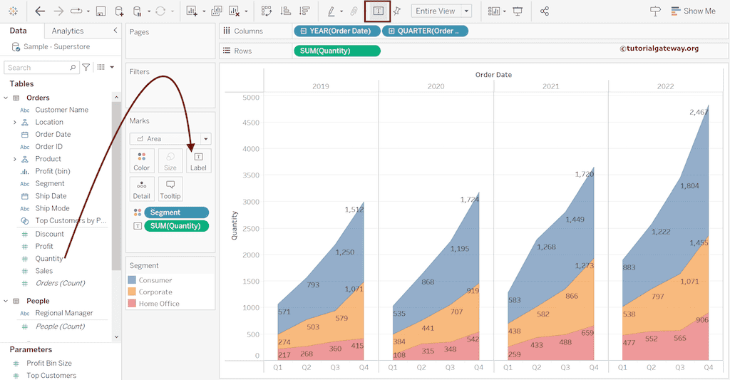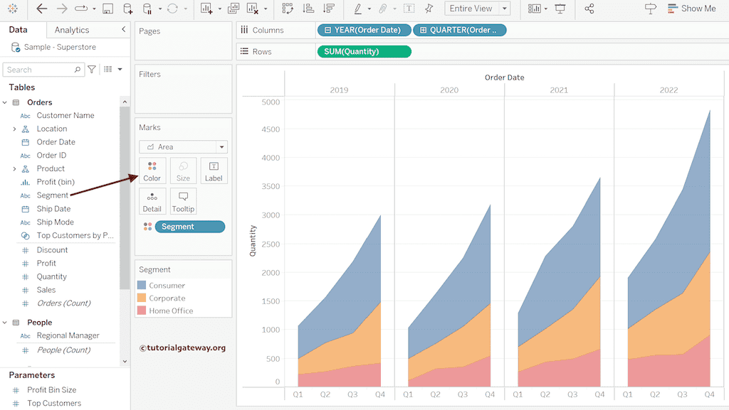 从下面的屏幕截图中,我们将“客户细分”字段添加到了所有(销售和利润)的“颜色”架中,以进一步细分面积图。