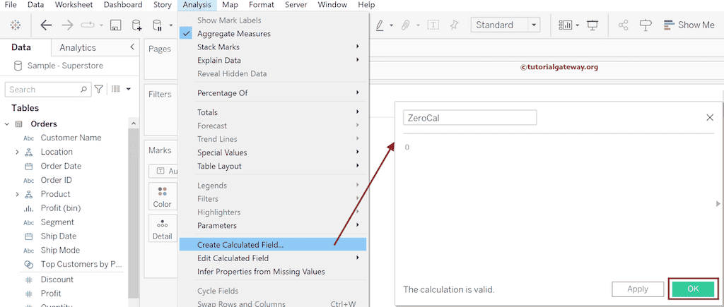 “显示我”窗口中没有预定义的支撑选项,因此我们必须手动创建它们。因此,在我们开始创建 Tableau 甜甜圈图之前,我们必须首先创建一个值为零的计算字段。为此,请转到“分析”菜单,单击“创建计算字段”选项,然后分配任何名称(ZeroCal)并硬编码零作为值。