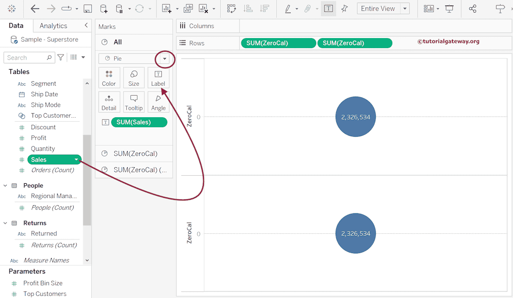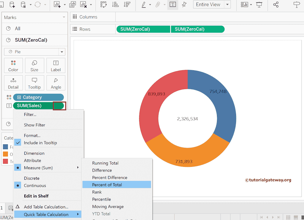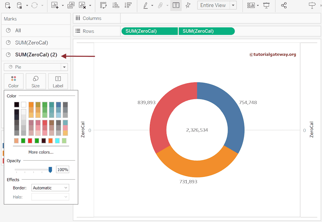 例如,如果您观察到上面的 Tableau 甜甜圈图“标记”卡部分,我们有“全部”、“SUM(ZeroCal)”和“SUM(ZeroCal)(2)”部分,其中“全部”属于这两个字段。但是,您可以选择特定的计算字段来处理它们。