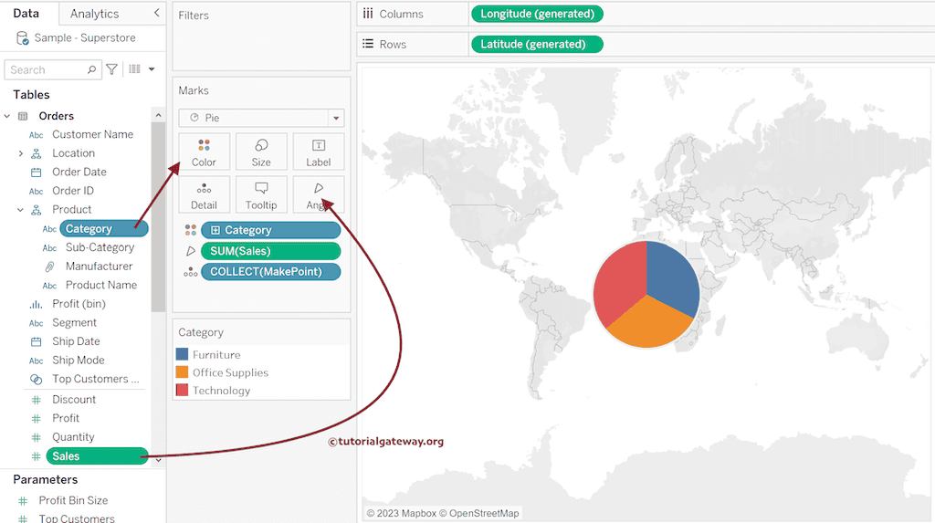 步骤 3 – 将标记类型更改为饼图:请将标记类型从自动更改为 饼图。接下来,将类别维度添加到颜色功能区,将销售额度量添加到角度功能区。