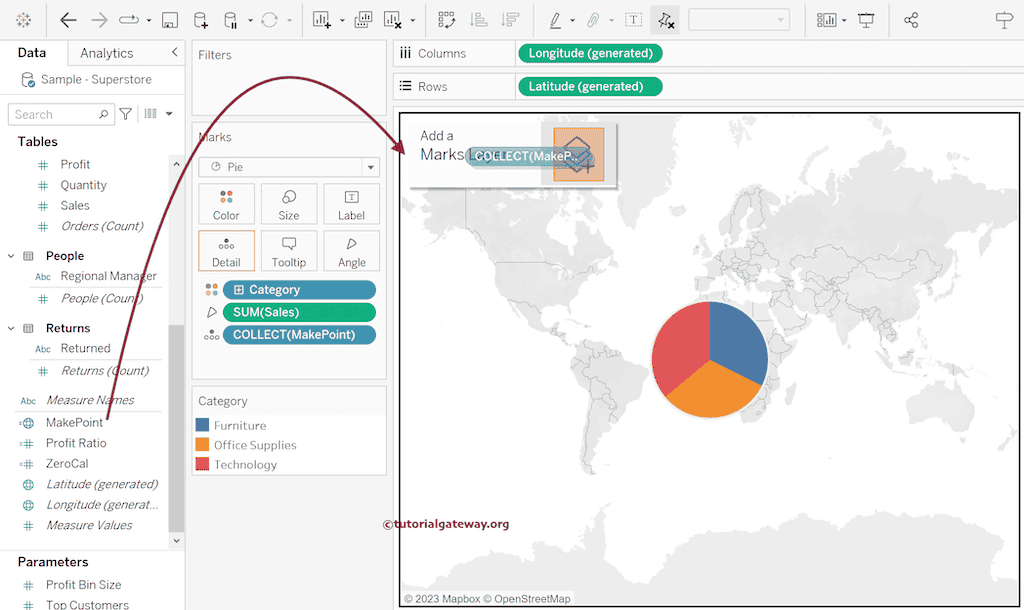步骤 4 – 添加集合以创建甜甜圈图:我们需要一个内部圆来创建甜甜圈图。为此,请将 MAKEPOINT 字段拖放到“标记”图层以创建另一个饼图集合。