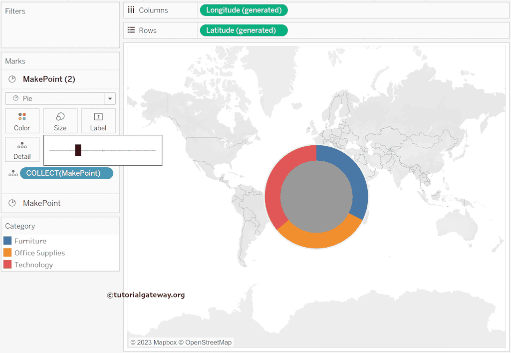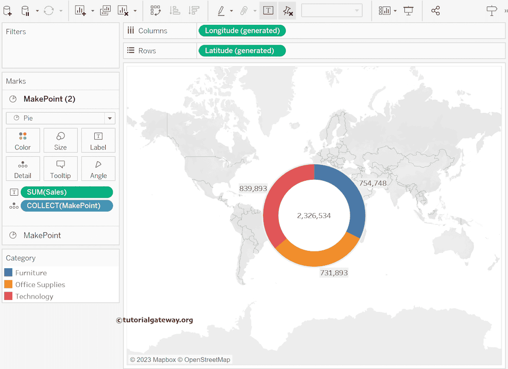另一个选项是使用 MAKEPOINT 函数和地图。本节介绍如何使用 0, 0 坐标的 MAKEPOINT 函数和地图创建甜甜圈图。