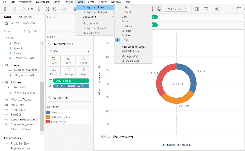 如果您观察到上面的 Tableau 图像,尽管它看起来像一个甜甜圈图,但背景地图不允许您将注意力集中在甜甜圈上。因此,我将使用地图菜单将其删除。为此,请转到“地图”菜单,选择“背景地图”选项,然后单击“无”选项。