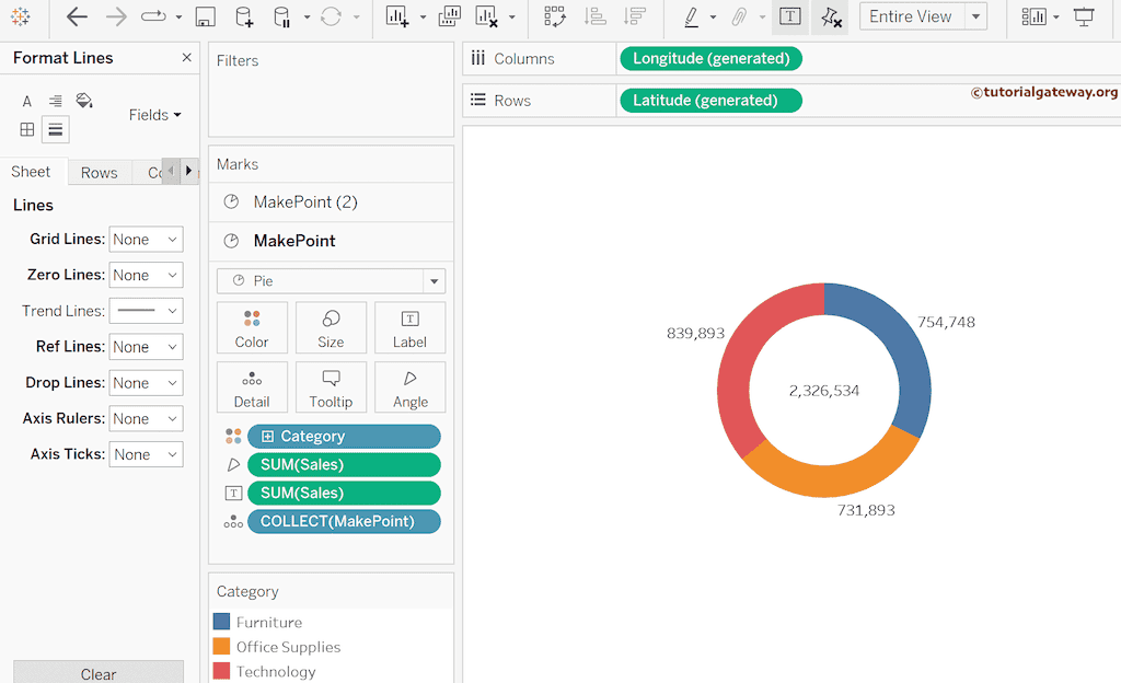 下一步是删除纬度和经度线以及网格线。使用“格式”菜单格式化字体并删除 Tableau 甜甜圈图的零线、网格线和轴刻度。