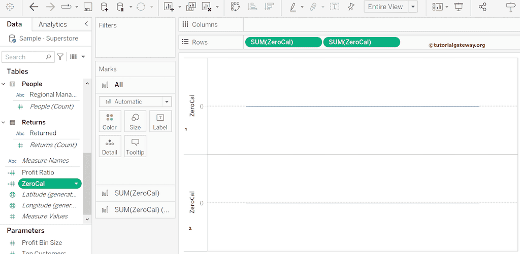 对于此甜甜圈图,我们需要两个轴,一个用于饼图,另一个用于中间的空白圆。因此,将该 Tableau 计算字段(ZeroCal)多次拖到“行”功能区。此 计算字段 将将工作表分成两个相等的部分。有关更多图表,请 单击此处。