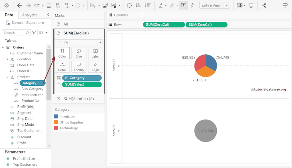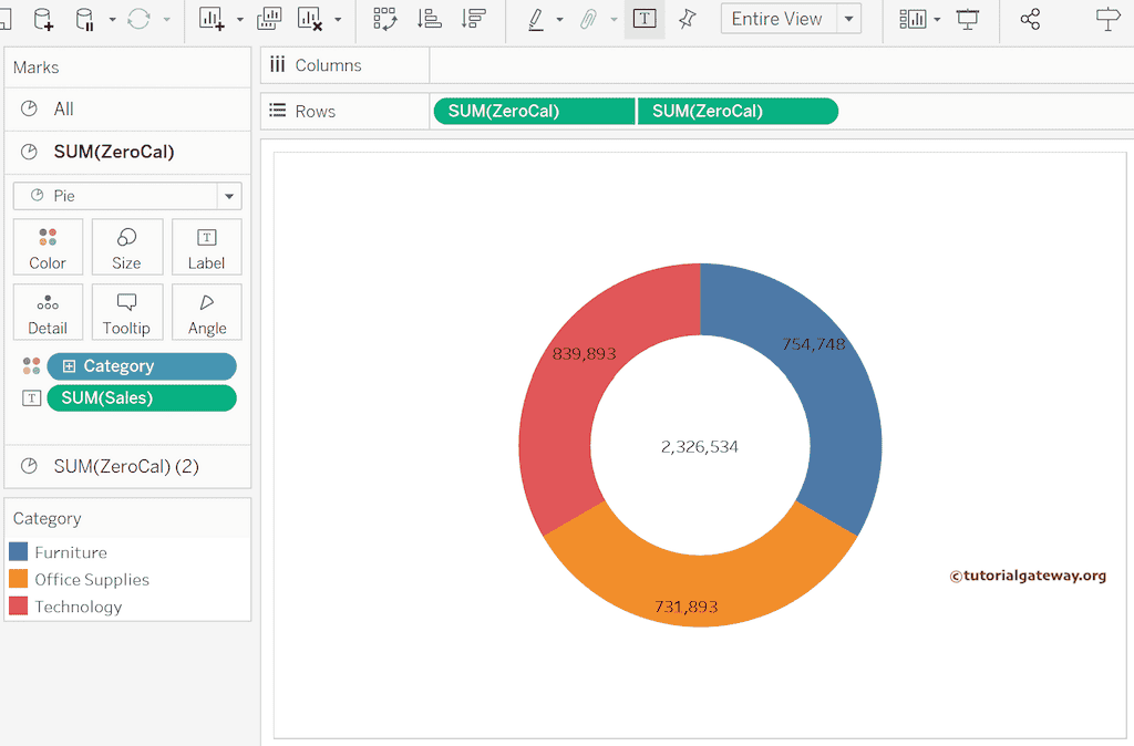 从“标记”卡功能区选择 SUM(ZeroCal),然后将“类别”维度拖放到“颜色”功能区。您将在第一个轴上看到类别。但是,如果您观察到甜甜圈图工作表,它会在第二个轴上显示销售额总和。因此,我们需要做一些工作才能将其显示在第二部分。