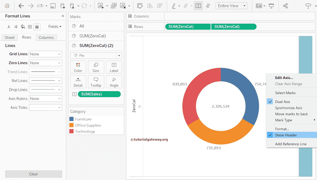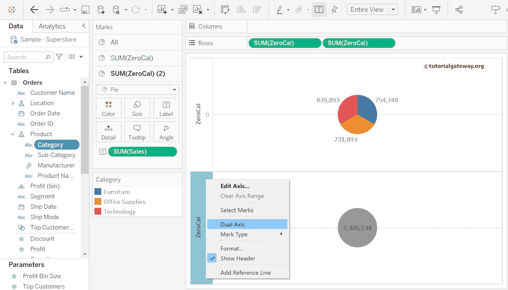 将饼图转换为 Tableau 甜甜圈图需要双轴。选择并右键单击“行”功能区上的第二个度量(SUM(ZeroCal)(2))或轴将打开上下文菜单。单击双轴将为您完成此操作。在这里,我们右键单击第二个计算并选择了 双轴 选项。