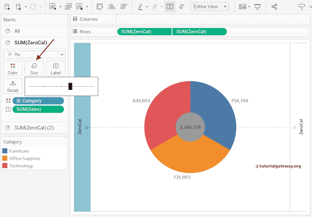 我们将这两个饼图转换为甜甜圈图。接下来,从“标记”功能区选择第二个 SUM(ZeroCal) 并增加滚动条大小以增加甜甜圈的外部圆圈。