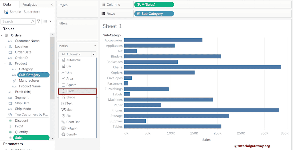 我们需要一个度量和维度来创建点图。因此,将“Sales”度量拖到“Columns”(列)架上,将“Sub-Category”(子类别)维度拖到“Rows”(行)架上。默认情况下,Tableau 会为您创建一个条形图。因此,请将“Marks”(标记)从默认的“Automatic”(自动)选项更改为“Circle”(圆形)。