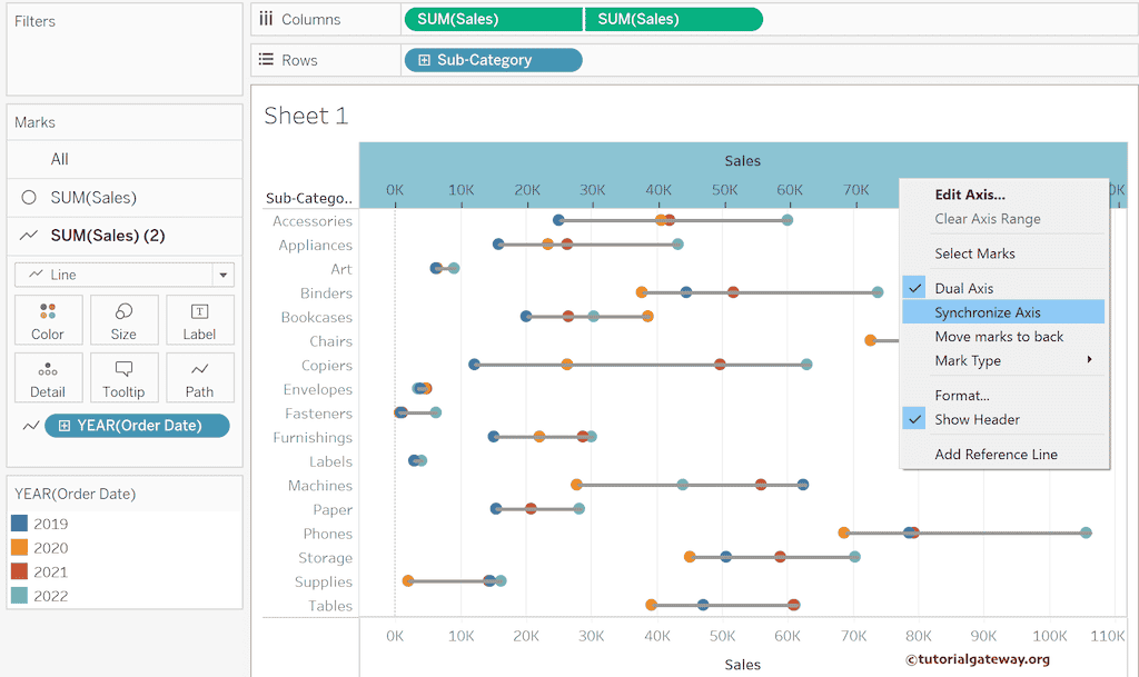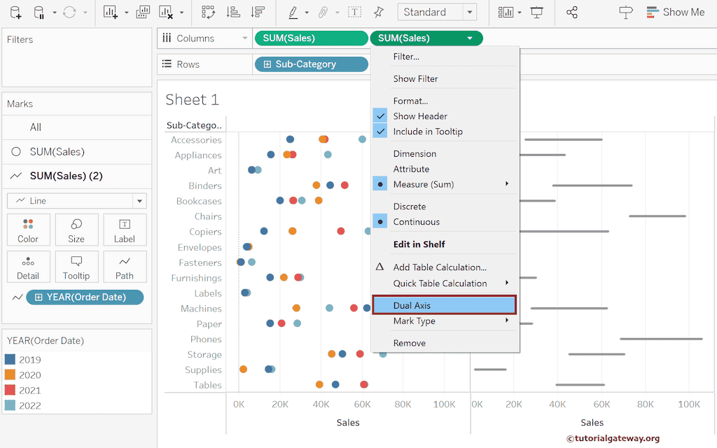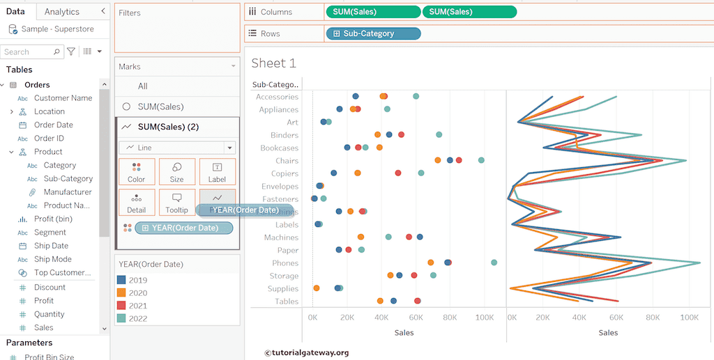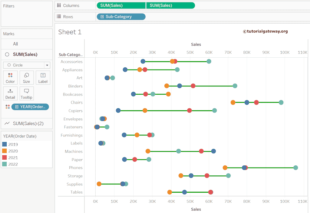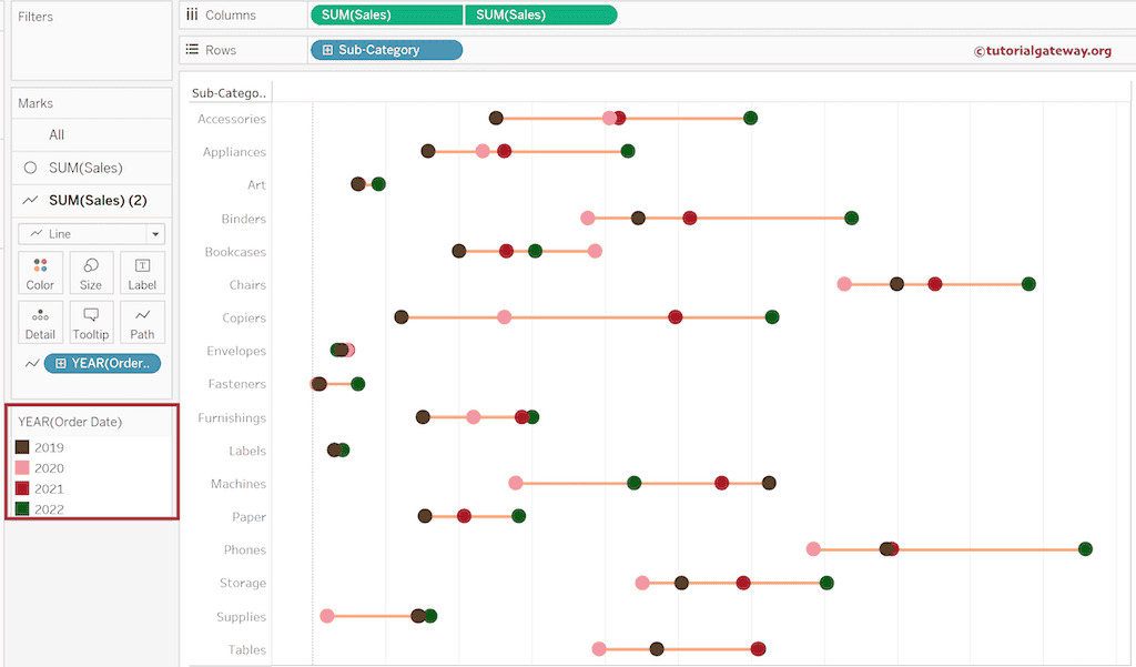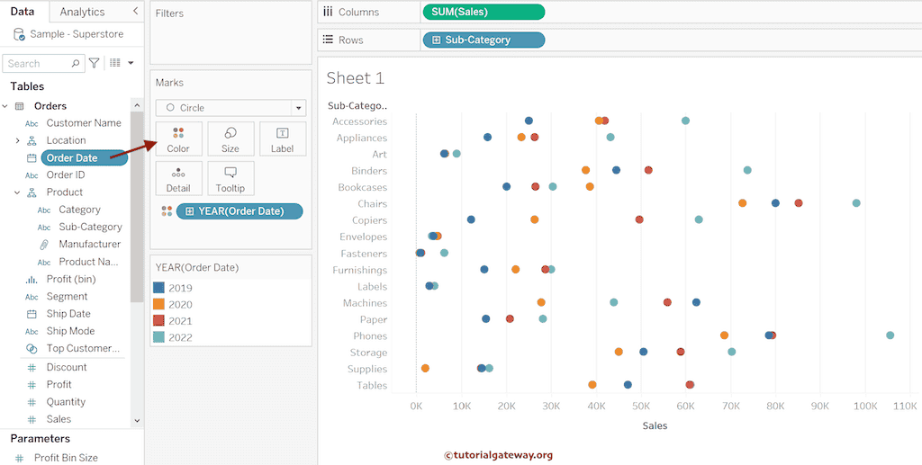 与条形图不同,Tableau 将在每个子类别的端点绘制简单的圆形或点。让我通过将“Order Date”(订单日期)添加到“Color”(颜色)架来进一步细分“Sales”。由于数据集中有四年,因此每个子类别会显示四个点,每个颜色代表相应的年份。