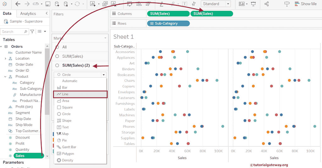 再次将“Sales”度量拖到“Columns”(列)架上,以创建双轴图。接下来,将第二个轴(SUM(Sales)(2))的“Marks”(标记)类型更改为“Line”(线)。有关更多图表,请点击此处。
