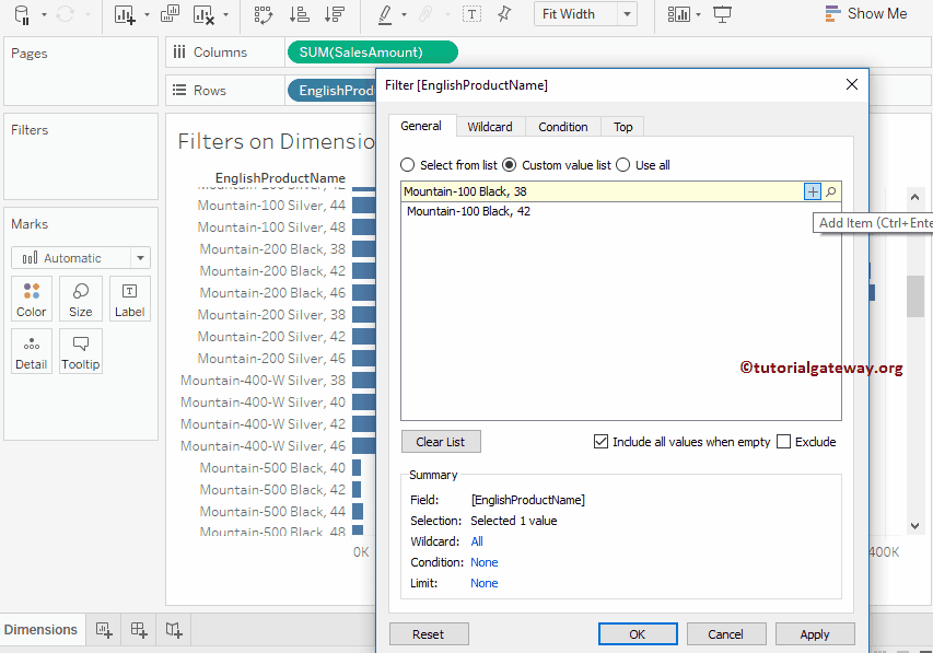 从下面的屏幕截图中,您可以看到我们为 Tableau 维度筛选器添加了两个记录。