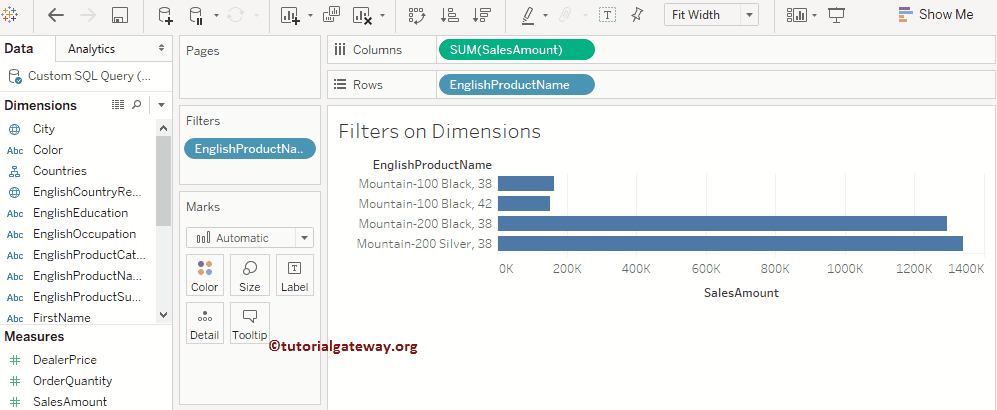 让我将 Tableau 维度筛选器选项从“包含”更改为“开头是”,并将匹配值更改为“Mountain”。现在,我们的报告显示了“英文产品名称”维度中所有以“Mountain”关键字开头的记录。
