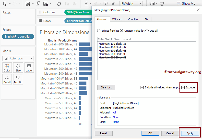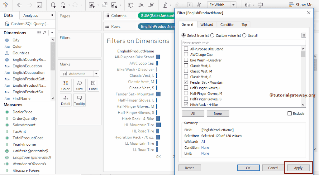 为了进行 Tableau 维度筛选器演示,我们取消选中了几个随机记录,然后单击了“应用”按钮。在这里,“应用”按钮将在不关闭“筛选器”窗口的情况下自动反映报告。