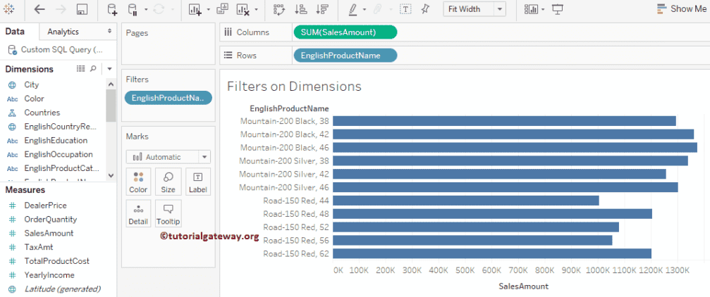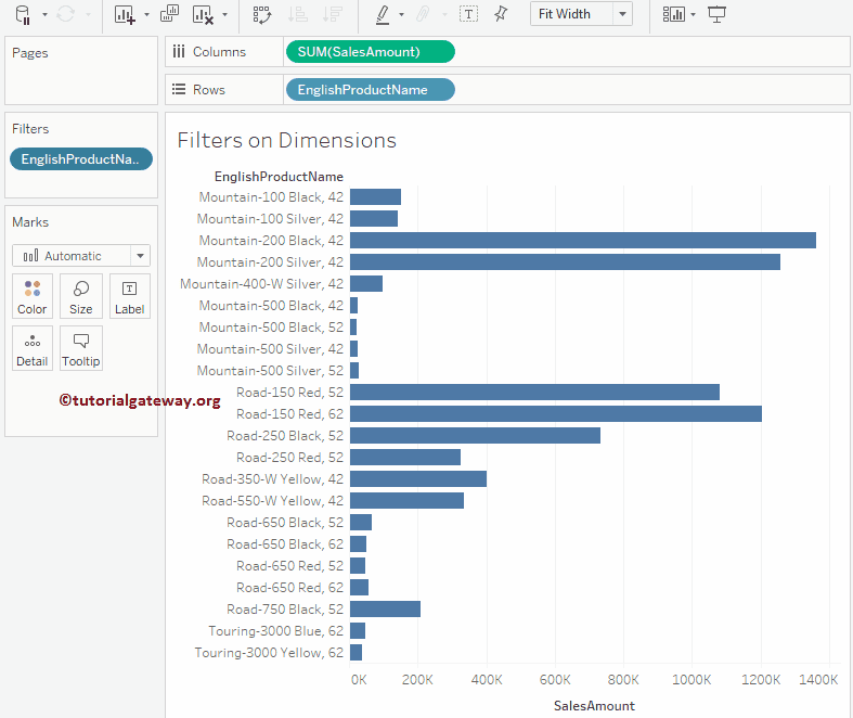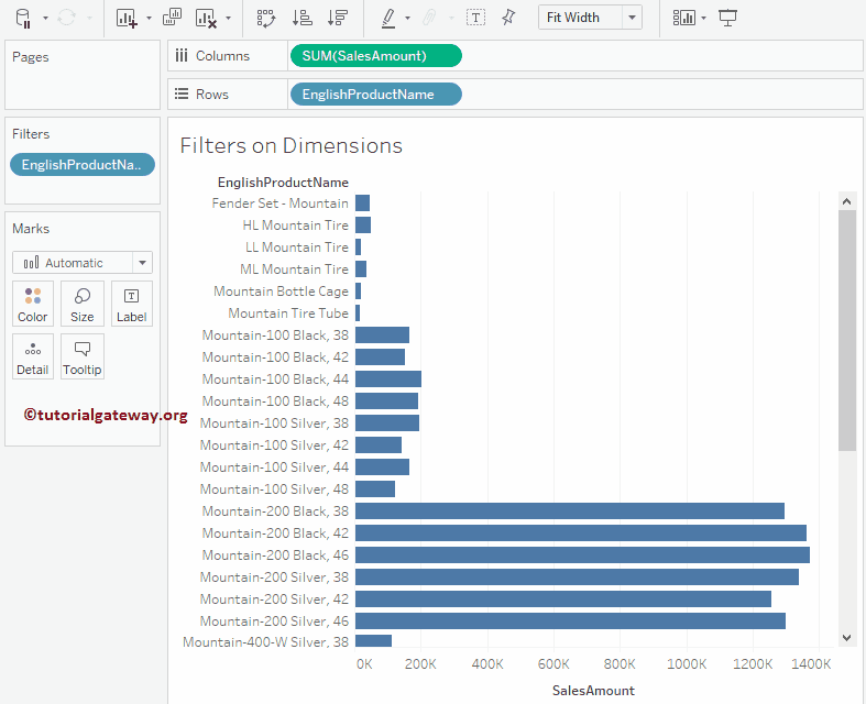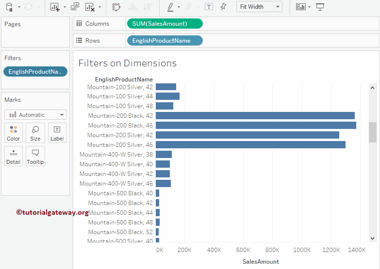 首先,将“英文产品名称”从维度区域拖放到“行”架,并将“销售额”度量区域拖放到“列”架。默认情况下,它将生成条形图。请记住,我们的报告中有 130 个标记。