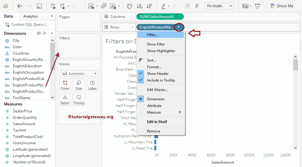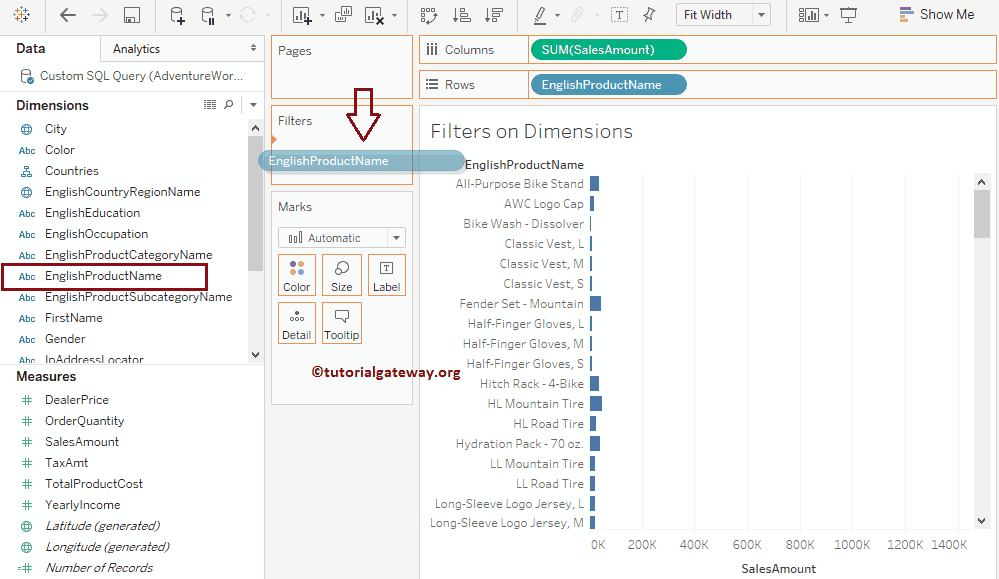 在此 Tableau 维度筛选器示例中,我们将向产品名称添加筛选器条件。首先,请将“产品名称”从维度区域拖放到“筛选器”架。