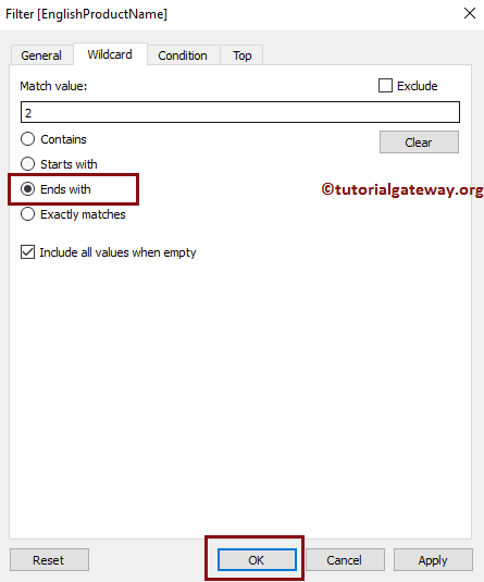 现在,我们的报告显示了“英文产品名称”维度中所有以整数 2 结尾的记录。