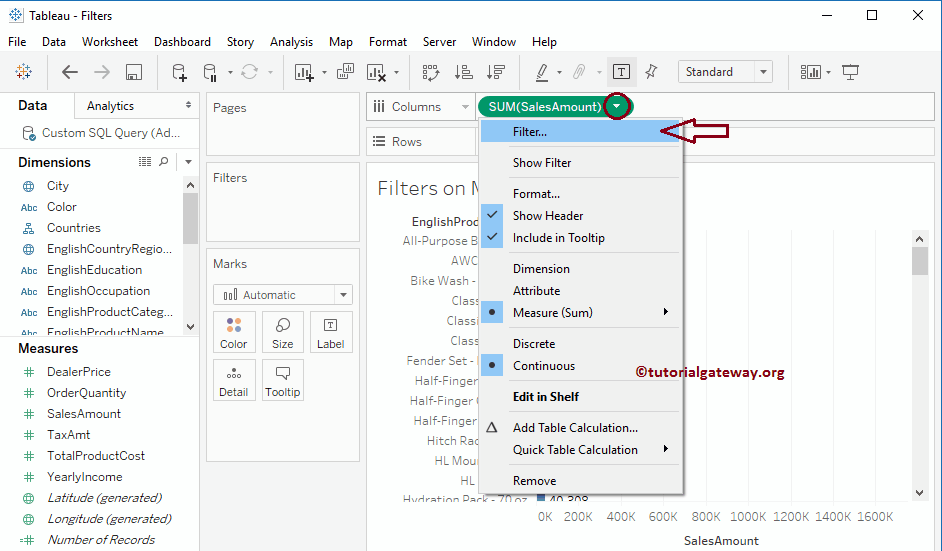 在此度量值过滤器示例中,我们将从“Column Shelf”添加一个过滤条件。首先,请单击“Column Shelf”中“Sales Amount”旁边的向下箭头,这将打开菜单。在这里,您必须选择“Filter..”选项。