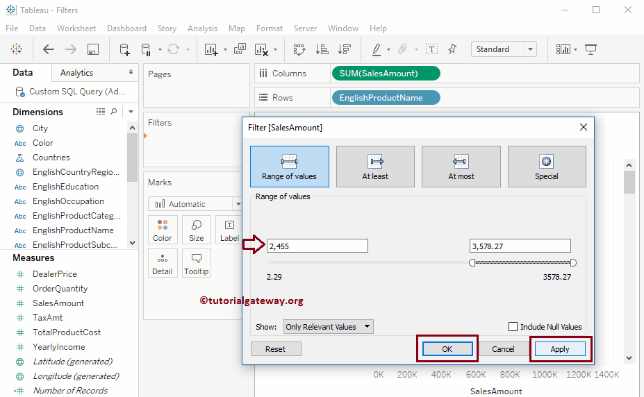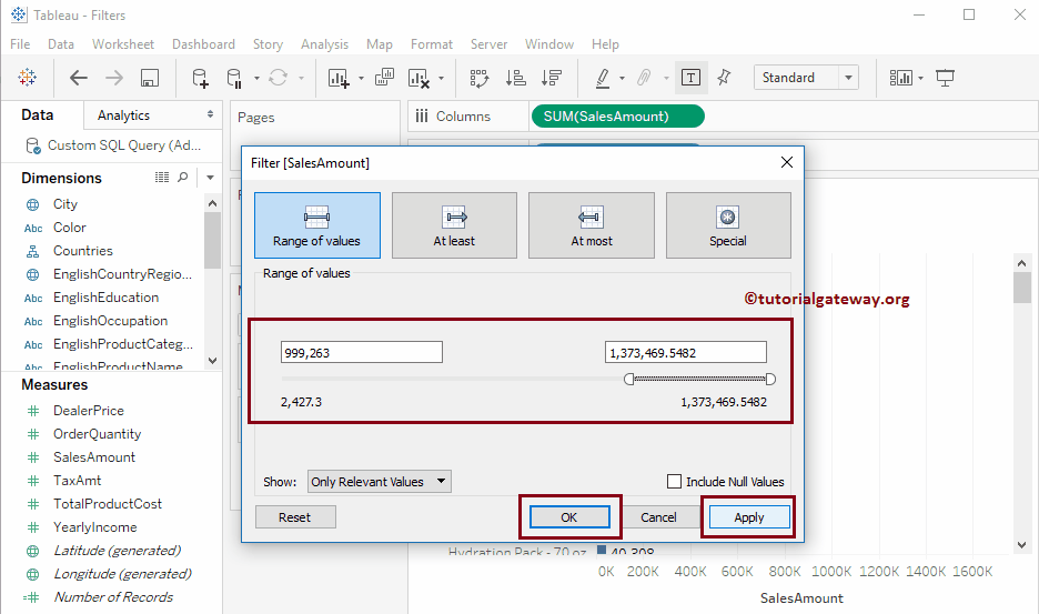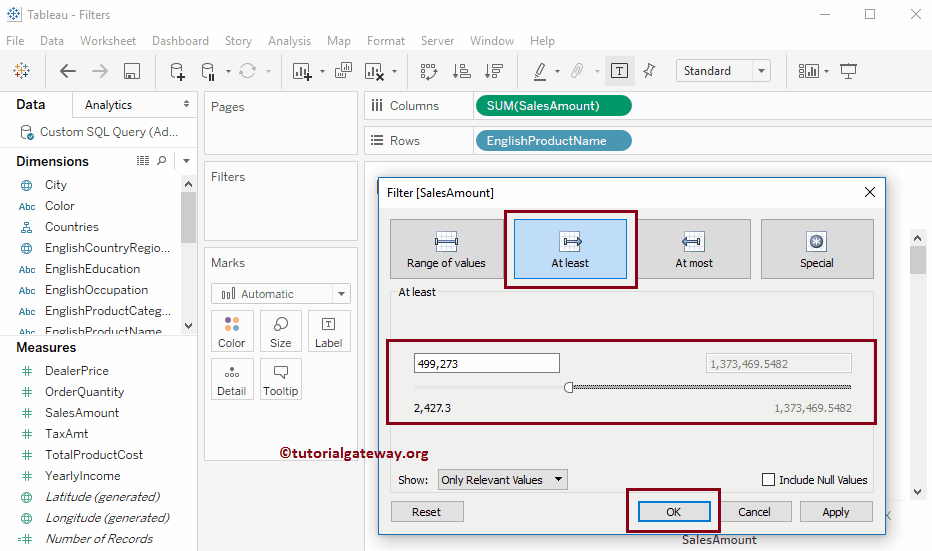 此选项卡允许您仅选择最小值。对于 Tableau 度量值过滤器演示目的,我们将值更改为 499,273。