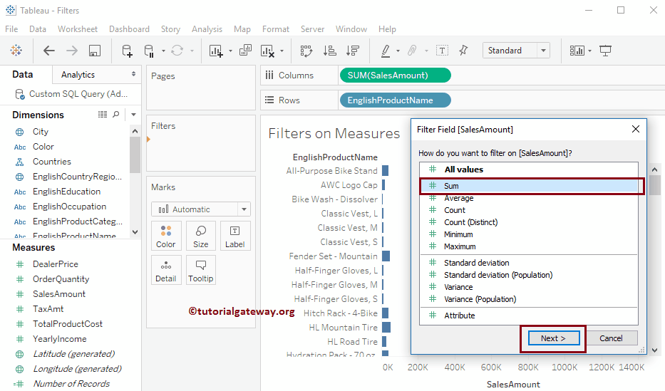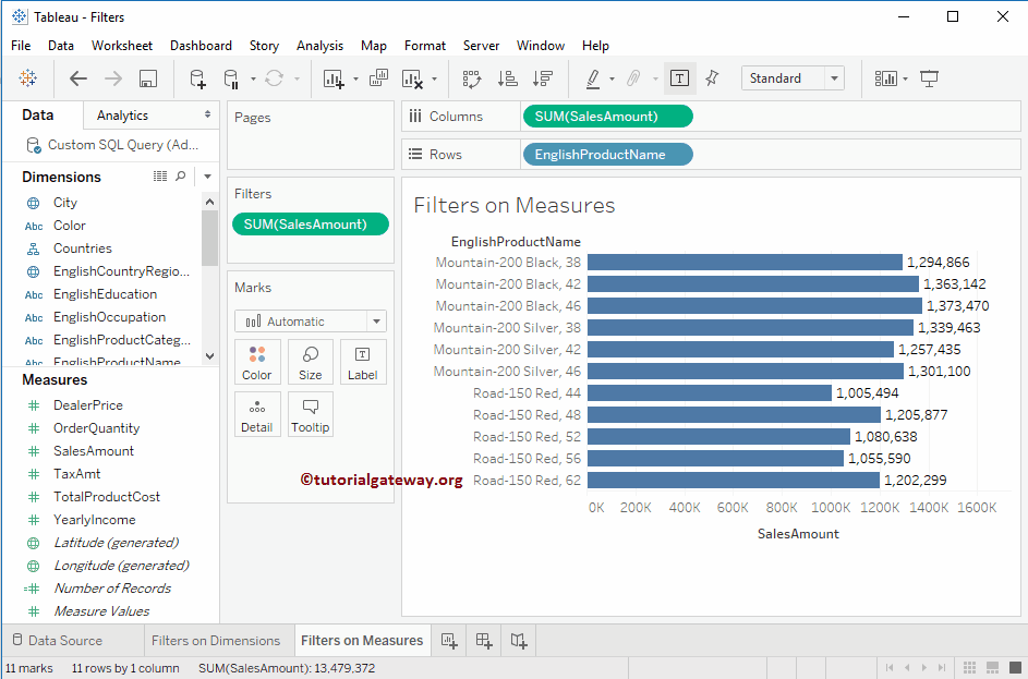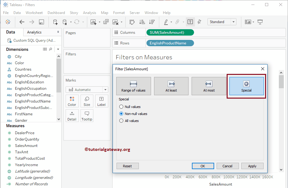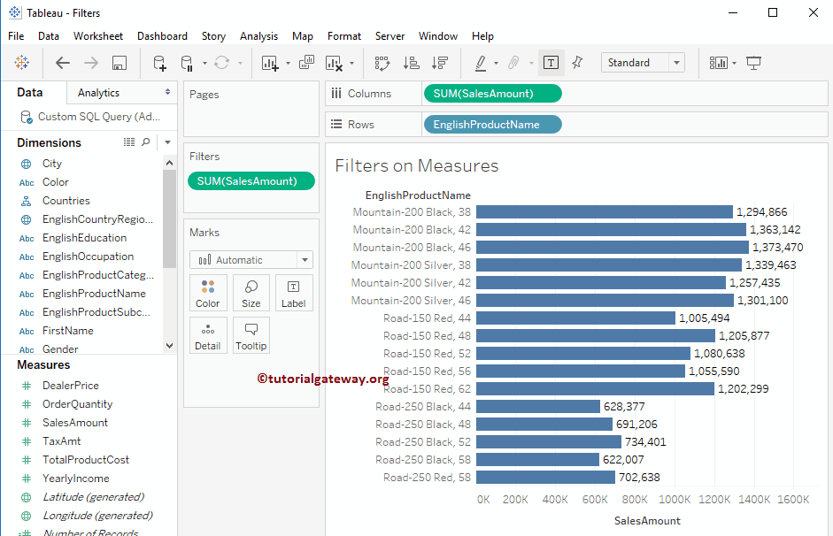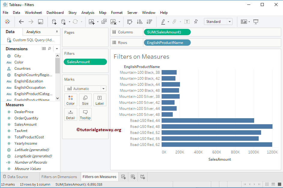 在此度量值过滤器示例中,我们将为“Sales Amount”添加一个过滤条件。因此,请将“Sales Amount”从“Measures Region”拖放到“Filters Shelf”上。